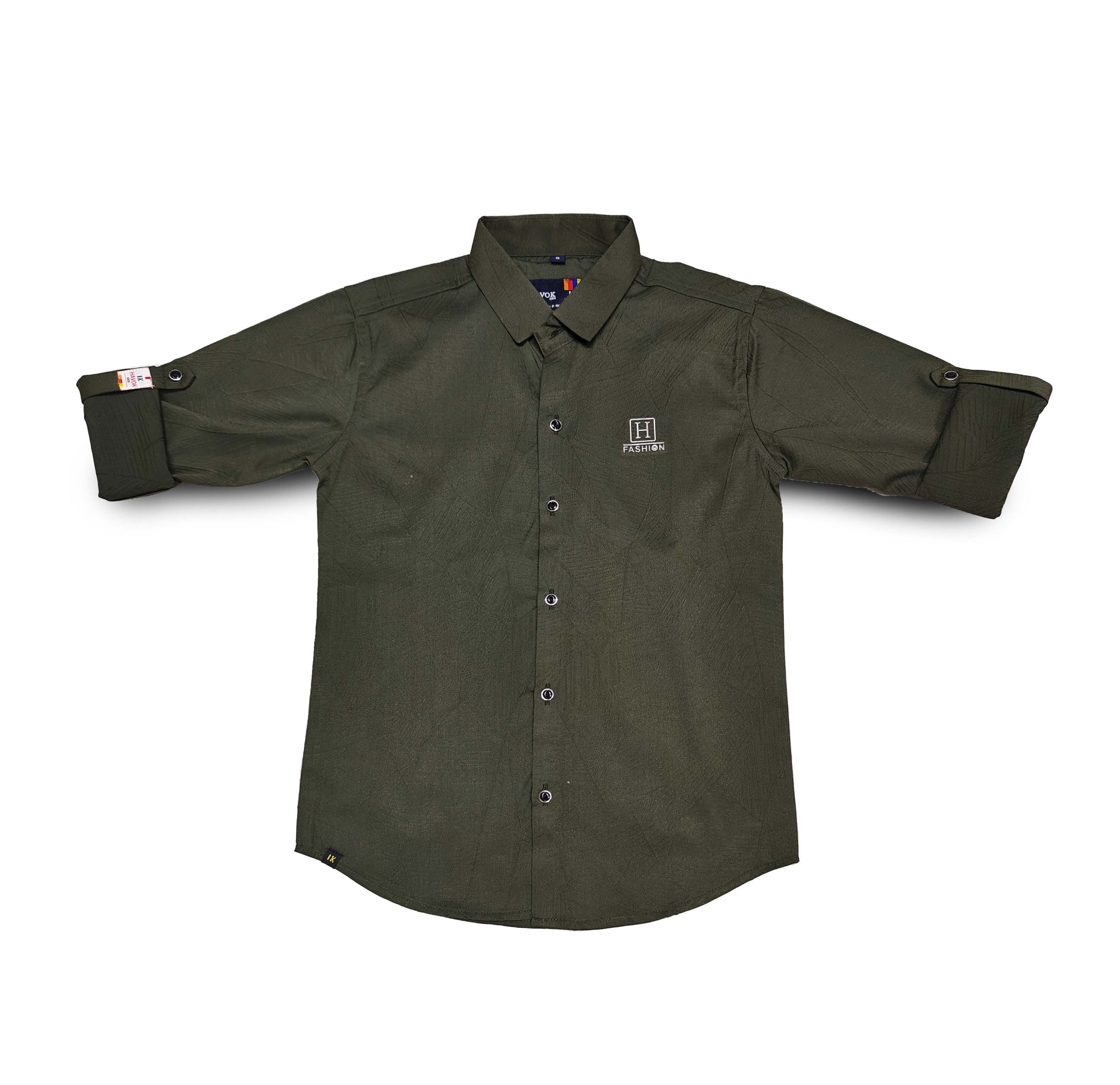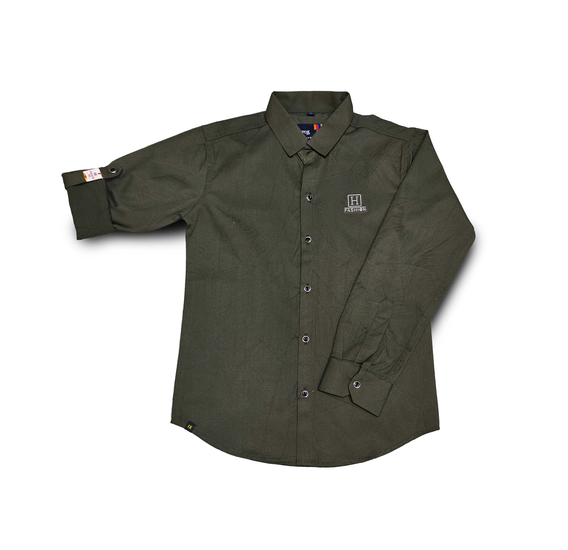 Elevate your little one's wardrobe with this sophisticated olive green shirt. Crafted with attention to detail, this smart casual shirt features a classic collar, full-length sleeves with roll-up tabs, and a convenient button-front closure. The premium cotton fabric ensures breathability and comfort for all-day wear. The sleek 'H Fashion' logo embroidery adds a touch of style, while the adjustable sleeves make it versatile for different occasions and weather conditions. Perfect for school functions, casual outings, or special occasions when paired with trousers or jeans. The durable stitching and quality buttons ensure long-lasting wear. Available in various sizes, this shirt combines style and practicality for the modern youngster. Hand wash recommended to maintain the shirt's crisp appearance and fabric quality.